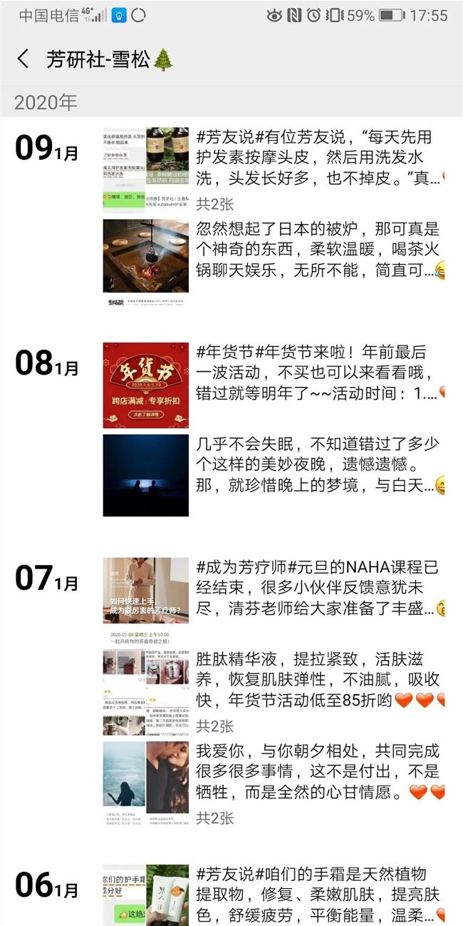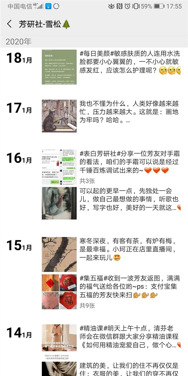 為了讓品牌的調(diào)性保持一致,芳研社格外注意對(duì)外的形象打造。比如,除去清芬本人的微信外,另外 4 個(gè)客服微信的名字“草暖、藍(lán)蓮、雪松、甜橙“均源于精油。平時(shí),客服在朋友圈會(huì)有規(guī)律地發(fā)布內(nèi)容,包括三分之一芳療和護(hù)膚知識(shí),三分之一的生活美學(xué),還有三分之一的活動(dòng)通告、創(chuàng)始人日常、直播與微課預(yù)報(bào)、芳友返圖等等。當(dāng)然,芳研社的客服也會(huì)積極對(duì)用戶(hù)的朋友圈進(jìn)行點(diǎn)贊和評(píng)論。
